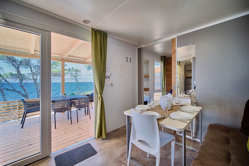 Mobilne kućice mogu primiti do 6 osoba, potpuno su opremljene i imaju velike terase sa kojih se pruža prekrasan pogled na more. Mobilne kućice su dimenzija 8x4m, odnosno 32 m2 i mogu ugostiti do 4+2 odraslih osoba. Svaka mobilna kućica ima svoju natkrivenu terasu od 24 m2 sa stolom i stolicama za 6 osoba. Mobilne kućice sadrže: opremljenu kuhinju sa kompletom posuđa za 6 osoba, frižiderom i zamrzivačem, sobu sa bračnim krevetom, sobu sa dva odvojena kreveta, dnevnu sobu sa krevetom na razvlačenje za dvije osobe, dva kupatila, klima uređaj, čaršave, peškire, parking mjesto, Wi-Fi. Posebne mjere (manje kontakta, dezinfekcija prostora).