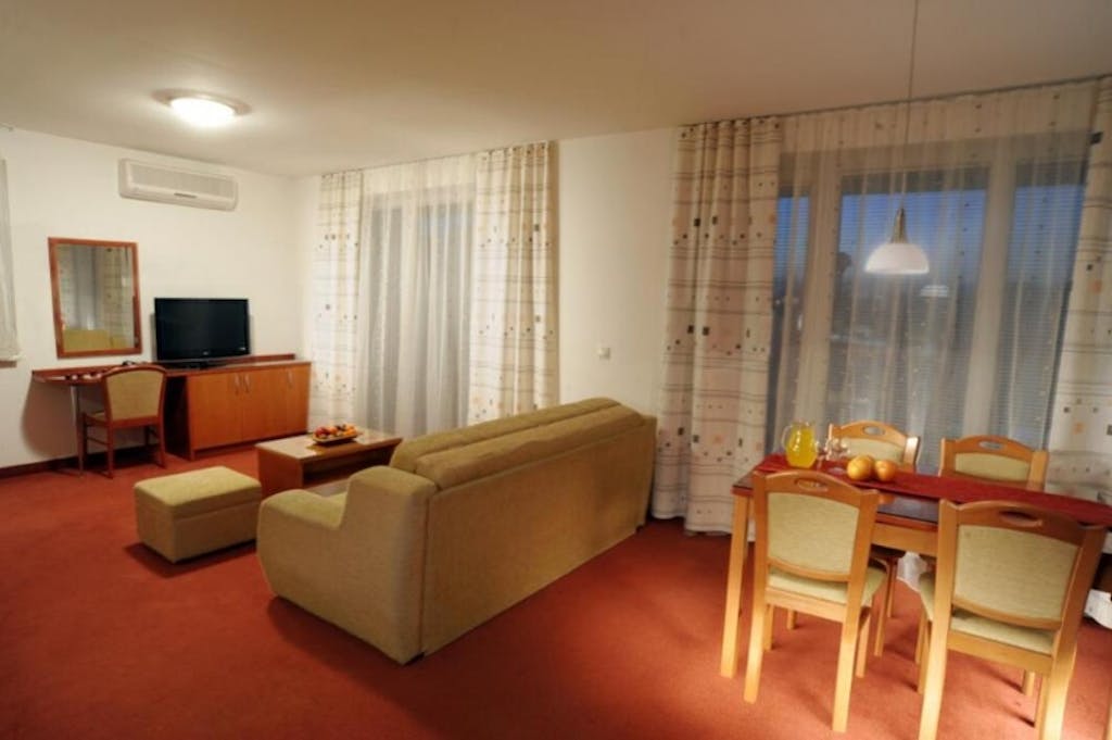 The pool complex Vivat includes outdoor and indoor water surfaces. In the sheltered area one may enjoy in a large, recreational pool with numerous water effect (massage bench, waterfalls…), two whirlpools and a pool for children, whereas in outdoor part of the complex is possible to swim in the Olympic pool (works seasonally) and dive into embrace of the healing thermal water. All pools are filled with thermal water. On the roof of the complex a nudist terrace with jacuzzi is situated and awaits all who love nude sunbathing, which besides excellent moments in the sun, offers also a beautiful view of the countryside.