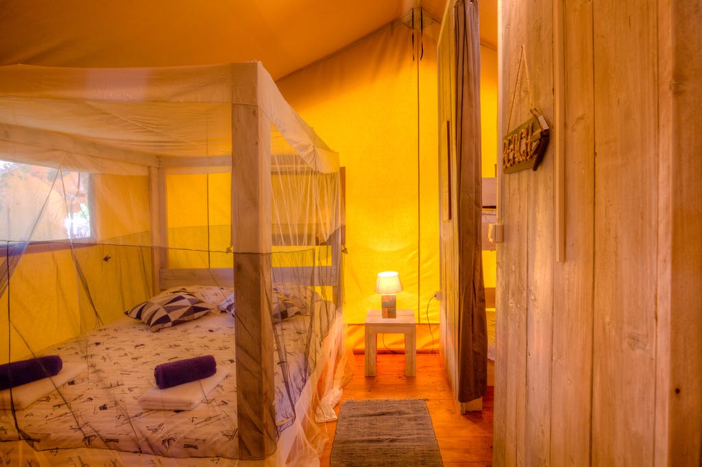 Šatori se nalaze u sjenovitoj borovoj šumi Bi-Villagea, samo nekoliko koraka od mora i imaju sve pogodnosti kampa (bazeni, restorani, trgovine, liječnička ordinacija, frizerski salon, bankomat, Wi-Fi).