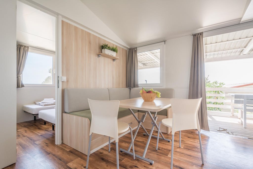 Prostrane i udobne mobilne kućice Dalmacija (32 m2) imaju jednu spavaću sobu s bračnim i jednu s dva ili tri odvojena kreveta, opremljenu dnevnu sobu, kuhinju i dvije kupaonice te parkirno mjesto u blizini i prostranu terasu s vrtnom garniturom.