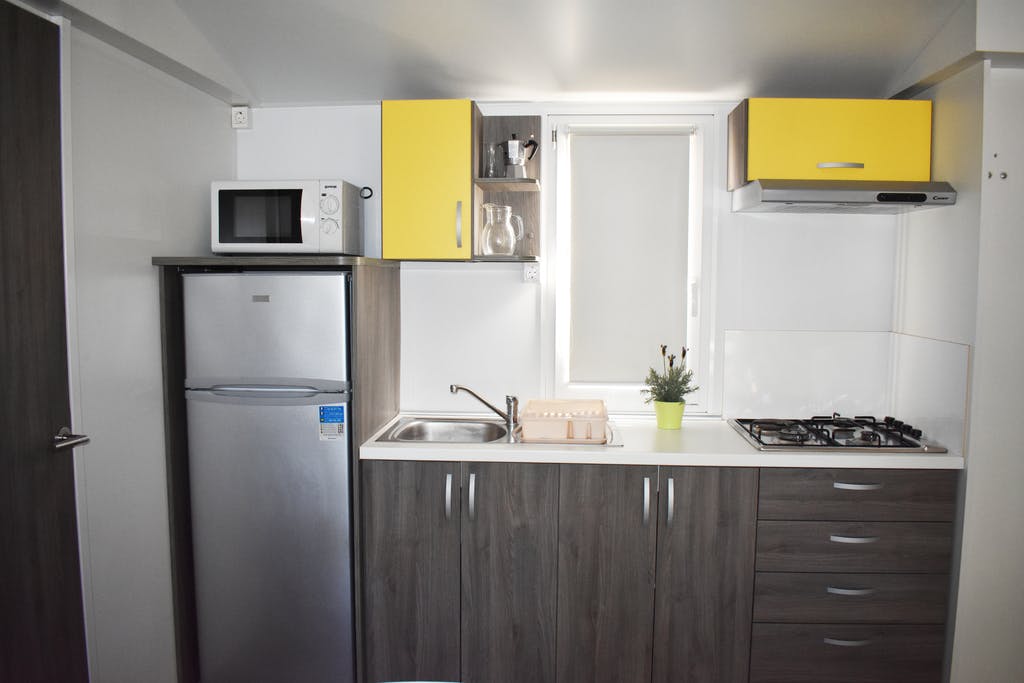 Kućice u svojih 32 metara kvadratnih mogu primiti do 6 osoba. Središnja prostorija je dnevna soba s kompletno namještenom i opremljenom kuhinjom. Dvije spavaće sobe su jednostavno, ali ugodno namještene te svaka ima svoju vlastitu kupaonicu s tuš kabinom, umivaonikom i zahodom. Sve mobilne kućice opremljene su klima uređajem. Prostrana terasa pred kućicom vaša je osobna oaza mira i mjesto koje će vam pružiti nezaboravne trenutke uživanja u autentičnom krajoliku, mirisima i zvukovima mediterana.