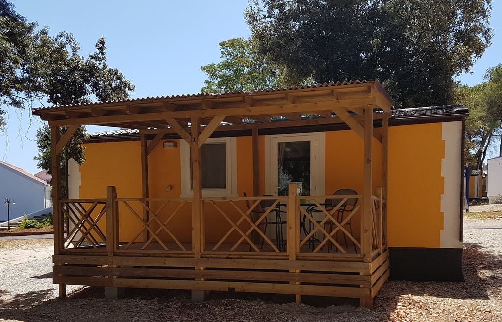 Kućice u svojih 32 metara kvadratnih mogu primiti do 6 osoba. Središnja prostorija je dnevna soba s kompletno namještenom i opremljenom kuhinjom. Dvije spavaće sobe su jednostavno, ali ugodno namještene te svaka ima svoju vlastitu kupaonicu s tuš kabinom, umivaonikom i zahodom. Sve mobilne kućice opremljene su klima uređajem. Prostrana terasa pred kućicom vaša je osobna oaza mira i mjesto koje će vam pružiti nezaboravne trenutke uživanja u autentičnom krajoliku, mirisima i zvukovima mediterana.