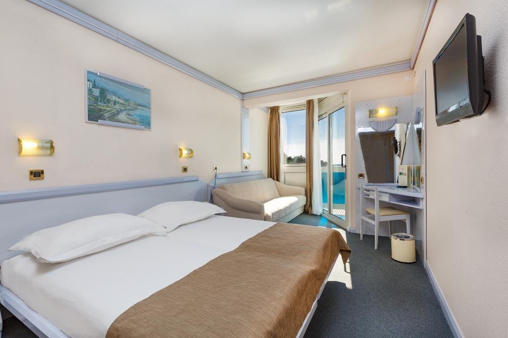 Suita s balkonom (32 m2): Nudi dvije sobe od kojih je jedna s dva ležaja (twin) za jednu osobu, a druga s dvosjedom na razvlačenje kao dodatnim ležajem. Tu je i kupaonica s kadom. Ima i balkon, sušilo za kosu, TV, mini bar, ogrtač za kupanje i papuče, sef, klimatizaciju.