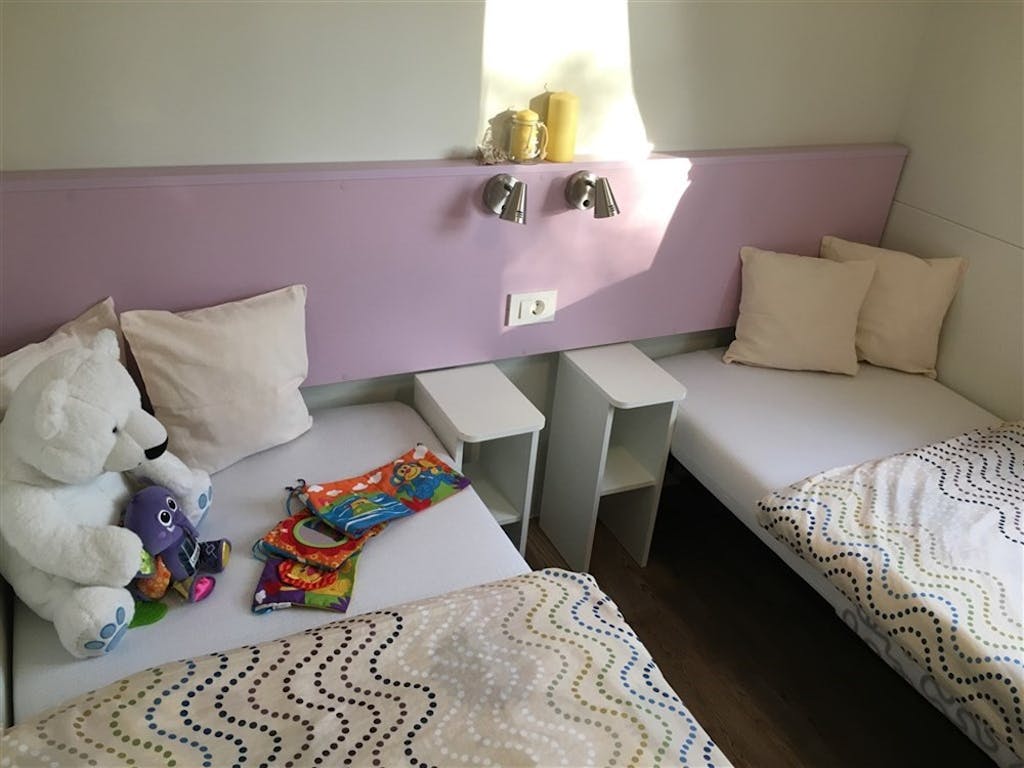 Mobilne kućice: 30m2, 2 sobe - jedna s bračnim krevetom (160x200) i dječja soba s 2 kreveta (80x200), dnevni boravak sa kaučem na razvlačenje, koji je pogodan za 2 djece i računa se kao pomoćni ležaj, 1 kupaonica, klima, TV, mreže protiv komaraca, natkrivena drvena terasa, posteljina, ručnici. Pogodna je za 4 odrasle osobe i 2 djece do 12 godina. Od mora cca. 250 m.