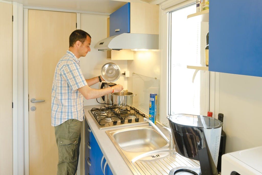 Mobilne kućice: 30m2, 2 sobe - jedna s bračnim krevetom (160x200) i dječja soba s 2 kreveta (80x200), dnevni boravak sa kaučem na razvlačenje, koji je pogodan za 2 djece i računa se kao pomoćni ležaj, 1 kupaonica, klima, TV, mreže protiv komaraca, natkrivena drvena terasa, posteljina, ručnici. Pogodna je za 4 odrasle osobe i 2 djece do 12 godina. Od mora cca. 250 m.