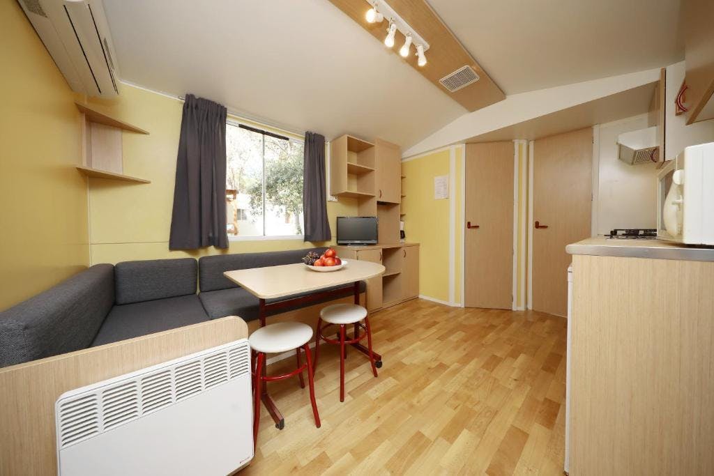 Svaka mobilna kućica sadrži 2 spavaće sobe, kuhinju, dnevni boravak s blagavaonom, kupaonicu, odvojeni wc, terasu s vrtnom garniturom i klima uređaj. U smještaj je uključena i posteljina za spavanje i ručnici. U cijelom kampu dostupan je besplatan Wi-Fi. Jedno parkirno mjesto je osigurano uz mobilnu kućicu, drugo se naplaćuje po cjeniku kampa.