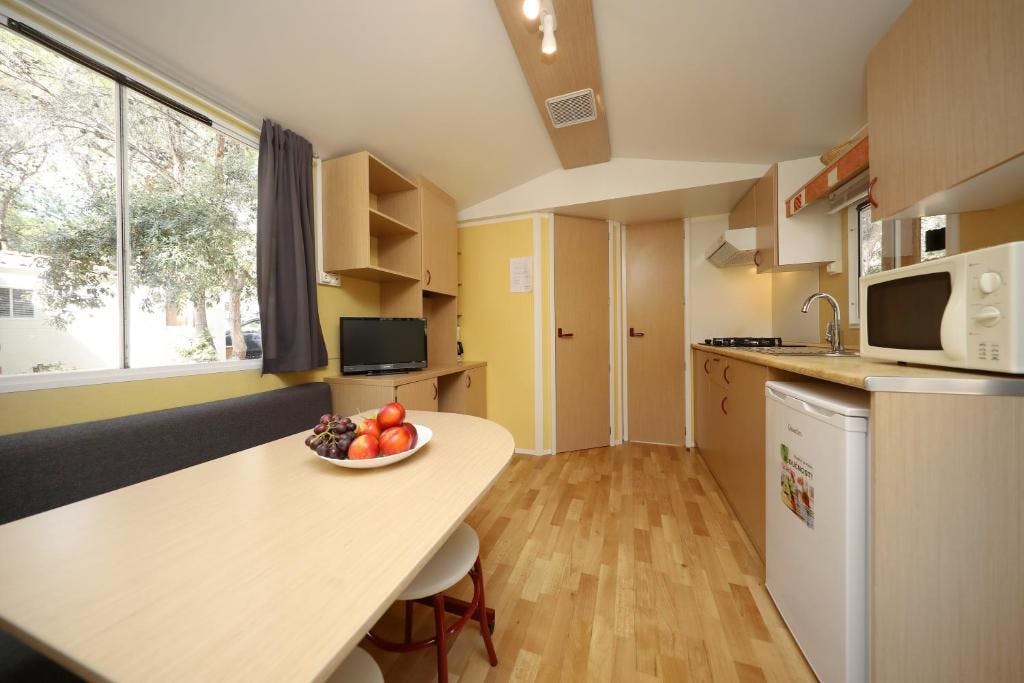Svaka mobilna kućica sadrži 2 spavaće sobe, kuhinju, dnevni boravak s blagavaonom, kupaonicu, odvojeni wc, terasu s vrtnom garniturom i klima uređaj. U smještaj je uključena i posteljina za spavanje i ručnici. U cijelom kampu dostupan je besplatan Wi-Fi. Jedno parkirno mjesto je osigurano uz mobilnu kućicu, drugo se naplaćuje po cjeniku kampa.