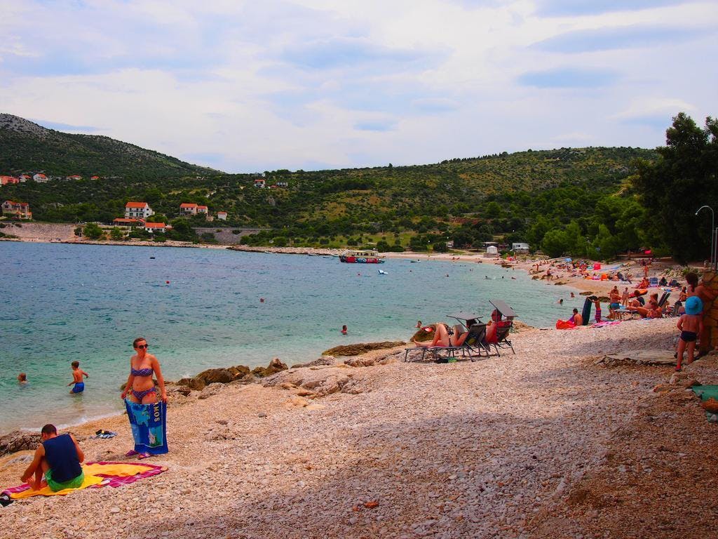 Plaža koja se nalazi približno 80 metara od kampa je dugačka 1 kilometar je kamena i djelomično šljunčana. Na plaži se nalaze i tuševi. Duga šljunčana obala, kristalno čisto more i hlad borove šume pružaju gostima mobilnih kućica beskrajno uživanje u lijepim danima i toplim večerima.