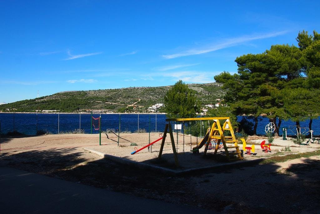 Plaža koja se nalazi približno 80 metara od kampa je dugačka 1 kilometar je kamena i djelomično šljunčana. Na plaži se nalaze i tuševi. Duga šljunčana obala, kristalno čisto more i hlad borove šume pružaju gostima mobilnih kućica beskrajno uživanje u lijepim danima i toplim večerima.