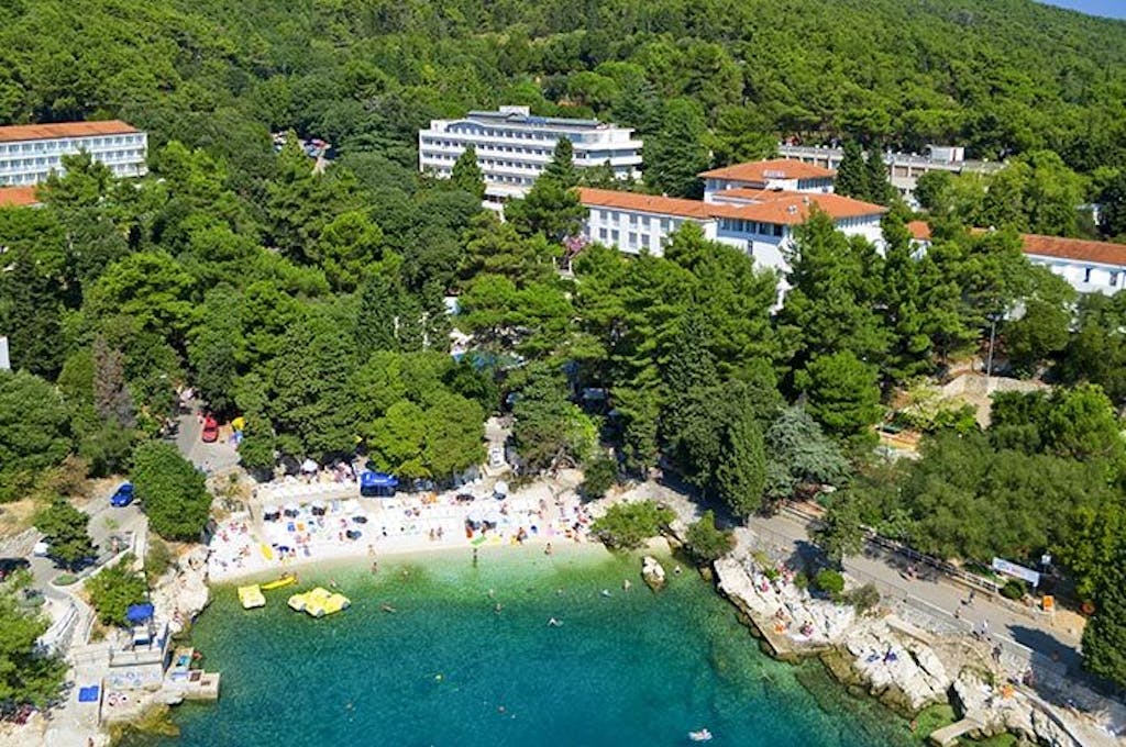 Biserno bijele rabačke plaže s oblutcima, slikovitim stijenama i blagim ulazom u čisto tirkizno more nalaze se samo 50 m od hotela. Hotel još nudi vanjski bazen punjen morskom vodom s pool barom na terasi u prirodnoj hladovini visokih borova.