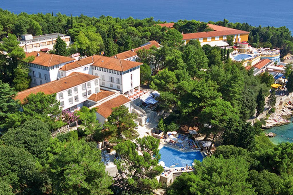 Biserno bijele rabačke plaže s oblutcima, slikovitim stijenama i blagim ulazom u čisto tirkizno more nalaze se samo 50 m od hotela. Hotel još nudi vanjski bazen punjen morskom vodom s pool barom na terasi u prirodnoj hladovini visokih borova.