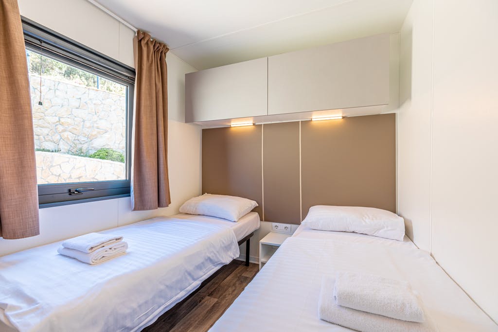Luksuzna kamping vila za parove s čajnom kuhinjom i terasom s pogledom na more je oaza za luksuzni odmor u kampu. Površina: 34 m² (24 m² unutrašnjost + 10 m² terasa), kapacitet: 2 osobe, info: natkrivena terasa površine 10 m² sa stolom, stolicama i ležaljkama za sunčanje.