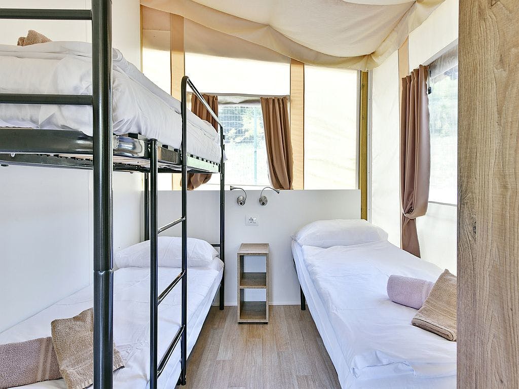 Bivajte v popolnoma novih glamping šotorih. Vsak šotor vsebuje popolnoma opremljeno kuhinjo, dnevno sobo, spalnico, sobo s pogradom, kopalnico, klimo, satelitsko TV, sef, nadkrito teraso, ob šotoru pa je na voljo tudi parkirišče