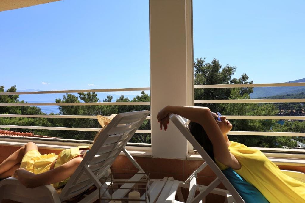 Udobni luksuzni apartmaji z dvema spalnicama so popolnoma opremljeni tako za kratkoročno kot dolgoročno bivanje, ti apartmaji ponujajo popolno mešanico udobja in praktičnosti. Vendar jih ločijo prostorne lože s pogledom na borov vrt, ki zagotavljajo intimen prostor za sprostitev. Udobno se namestite in uživajte v harmoniji vonja borovcev in zvokov morja.Deluxe apartma: 1 spalnica z zakonsko posteljo, 1 spalnica z dvema enojnima posteljama, kuhinja, dnevna soba z raztegljivim kavčem, kopalnica s kadjo, ločen WC, loža.
