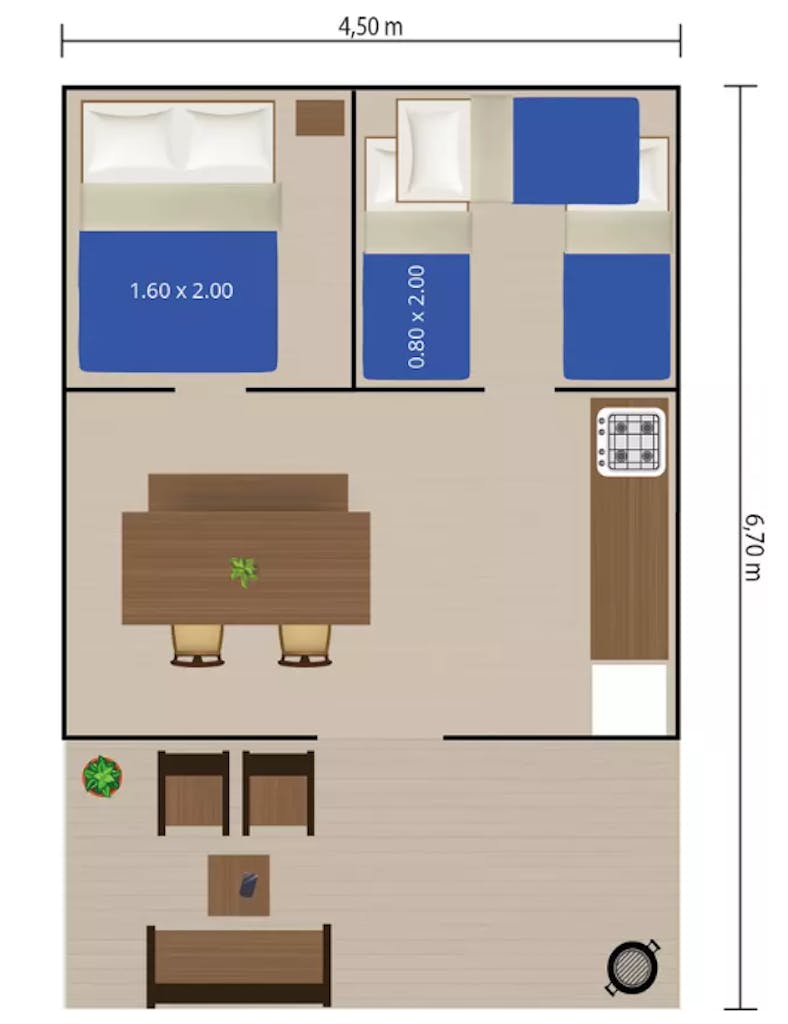Vsak šotor ima leseno teraso in razkošno dnevno sobo pod prostorno tendo, kjer lahko sedite zunaj ne glede na vremenske razmere. Platno med teraso in bivalnim prostorom lahko po želji delno ali v celoti dvignete in ustvarite dodaten bivalni prostor: popoln užitek na prostem, medtem ko ste še vedno zaščiteni. V notranjosti boste poleg prostorne kuhinje našli avtomat za vodo, mizo, stole in garderobno omaro. Standardno ima ta luksuzni safari šotor pet postelj: 1 zakonsko posteljo, 1 enojno posteljo in zelo trden pograd. Odeje, blazine in posteljnina so vključene, ko se odpravite na glamurozno kampiranje. Poleg tega je na voljo otroški paket, ki vključuje varno otroško posteljico in čvrst otroški stol. V šotoru (v kuhinji) ni tekoče vode, ampak je pipa tik pred šotorom. Vsak šotor ima svojo pipo s tekočo pitno vodo.