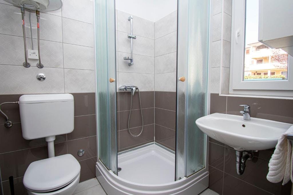 Apartma Tip C – Dvosobni apartma (cca 90m2) je sestavljen iz dveh hodnikov, dveh kopalnic, dveh spalnic, kombinirane kuhinje-dnevne sobe in dveh balkonov. V obeh spalnicah je zakonska postelja 160*200cm, garderobna omara in dve nočni omarici. Obe kopalnici imata tuš, WC, umivalnik. V dnevnem prostoru je raztegljiv kavč za dve osebi dimenzij 140/160*190/200cm in raztegljiv kavč za eno osebo, TV s satelitskimi programi. Na balkonu je tudi miza s stoli. Kuhinja je popolnoma opremljena z vsemi pripomočki. Ta apartma lahko sprejme do 7 oseb. Apartmaji imajo veliko nadzorovano parkirišče.