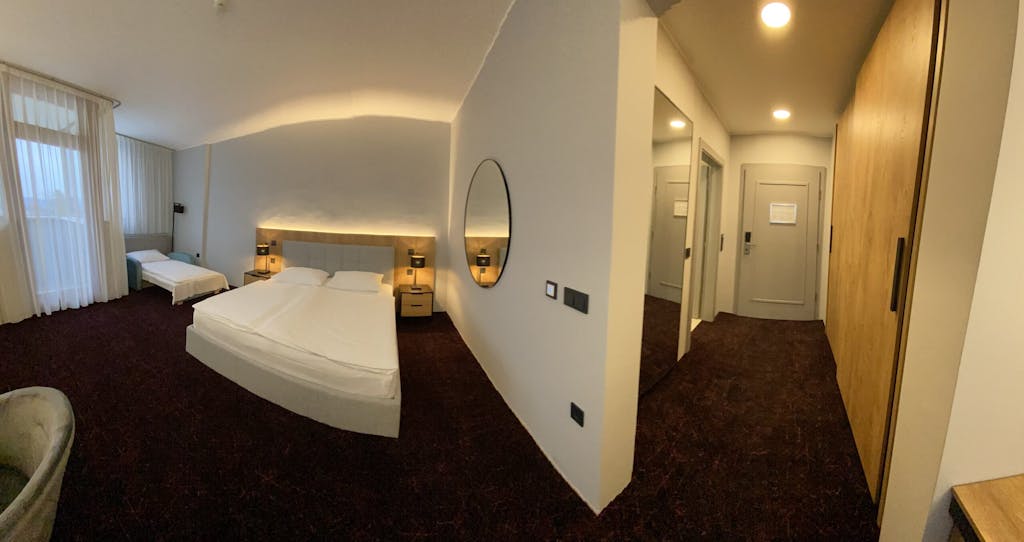 Standardna dvoposteljna soba z dodatnim ležiščem (35 m²) ponuja udobno bivanje v prijetno zasnovanem prostoru. Opremljena je z zakonsko posteljo, foteljem, ki si se uredi v dodatno ležišče, modernim pohištvom ter kopalnico. Idealna je za pare ali manjše družine, ki cenijo udobje in funkcionalnost.
