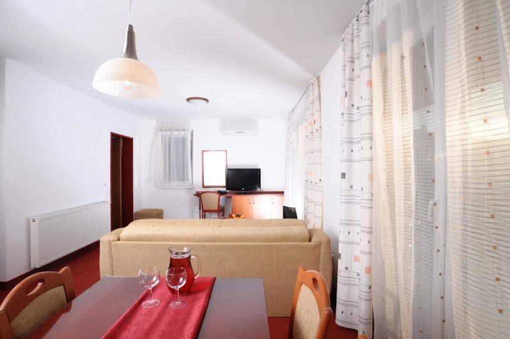 Apartma 1/2+1 (velikost: 45 m2): predprostor z garderobno omaro, kopalnica z omarico, tušem in WC-jem, manjša dnevna soba z raztegljivim dodatnim ležiščem v velikosti: 125 cmx200 cm, pisalna miza in televizor ter klima, spalnica s posteljo (postelja v velikosti: 160 cmx200 cm), omara, pisalna miza, balkonska terasa z vrtno sedežno garnituro.
