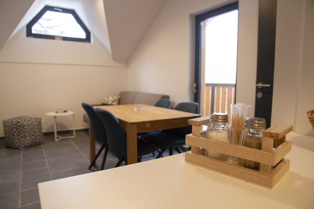 Apartma mansarda 4+2 – apartma v velikosti 44 m2 ima dve spalnici (spalnica z zakonsko posteljo, spalnica z dvema posteljama in dodatno ležišče, primerno za do dve osebi – 2 otroka ali 1 odraslo osebo. Dodatno ležišče je veliko 140 x 190 cm). Ima eno kopalnico s tušem in dnevno sobo s televizijo ter kuhinjo. Kuhinja je opremljena s posodo, hladilnikom, pomivalnim strojem in električnim štedilnikom. Apartma ima balkon pred vhodom. V apartmaju je na voljo brezplačen Wi-Fi, posteljnina in brisače. Vsem gostom apartmaja pripada brezplačen povratni prevoz z nihalko do hotela Golte in parkirišče na spodnji postaji nihalke. Gostje apartmajev lahko koristijo 20% popust na vse aktivnosti v poletni sezoni (zip line, plezalna stena, najem e-koles, supanje, voden ogled kraških jam, ogled Alpskega vrta, masaže…) Gostje imajo neomejen vstop v hotelski fitness.