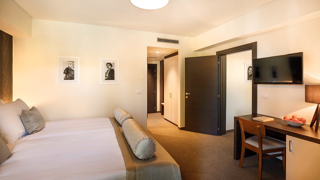 Družinska soba skupne površine 43 m2 za največ štiri osebe je idealna za družinske počitnice, polne veselja in zabave. Novourejena soba ima dve sobi druga ob drugi, v vsakem prostoru pa je zakonska postelja (180 x 200 cm). Razveselili vas bosta ločeni kopalnici s tušem. Prebudite se ob pogledu na park ali uživajte v jutranjem srkanju kave na lastnem balkonu. Za idealne počitnice je soba opremljena s telefonom z neposrednim klicanjem, mini barom, sefom in LCD TV sprejemnikom s satelitskimi programi.