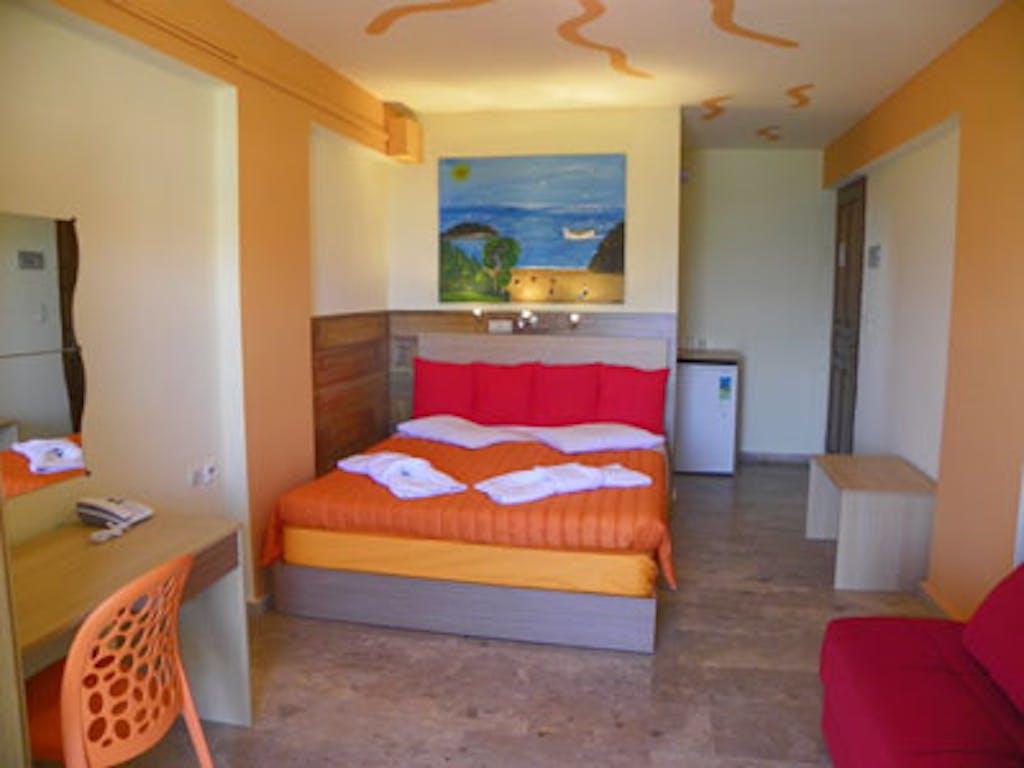 Većina soba nudi veličanstven pogled na Jonsko more. Sve ostale sobe imaju pogled na baštu. Opustite se u udobnim sobama ili se kraj bazena izležavajte na suncu. Sve sobe su opremljene modernim nameštajem koji je lepo ukombinovan sa originalnim slikama koje prikazuju detalje iz harmoničnog ostrvskog života. Poseduju klima uređaj, TV, frižider, kupatilo s tušem, sef, dasku za peglanje, telefon, fen za kosu i kozmetičke dodatke. Hotelske standardne dvokrevetne sobe su veoma udobne i osunčane (za 2-4 osoba) i poseduju 2 kreveta koja se mogu spojiti. Dodatni kreveti su takođe na raspolaganju. Hotel isto tako i nudi četverokrevetne smeštajne jedinice kao što su studiji te komforne, prostrane sobe. Namenjene su pre svega za 4 osobe i imaju bračni krevet te 2 odvojena kreveta. Takođe poseduju i potpuno opremljenu kuhinju sa svim neophodnim kuhinjskim priborom.