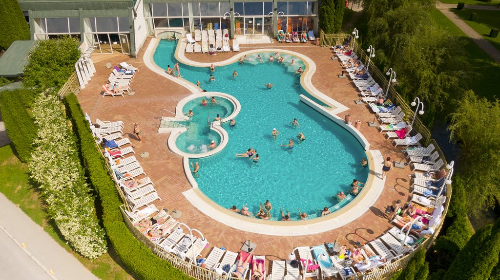 Unutrašnje-spoljašnji bazenski kompleks radi tokom cele godine, a sastoji se od poluolimpijskog bazena sa direktnim pristupom spoljašnjem delu bazena sa popločanom terasom i prekrasnim pogledom na park. Kompleks unutrašnjih i spoljašnjih bazena takođe uključuje dečiji bazen, masažne tuševe, hidromasažne kade i prave rimske kupke.