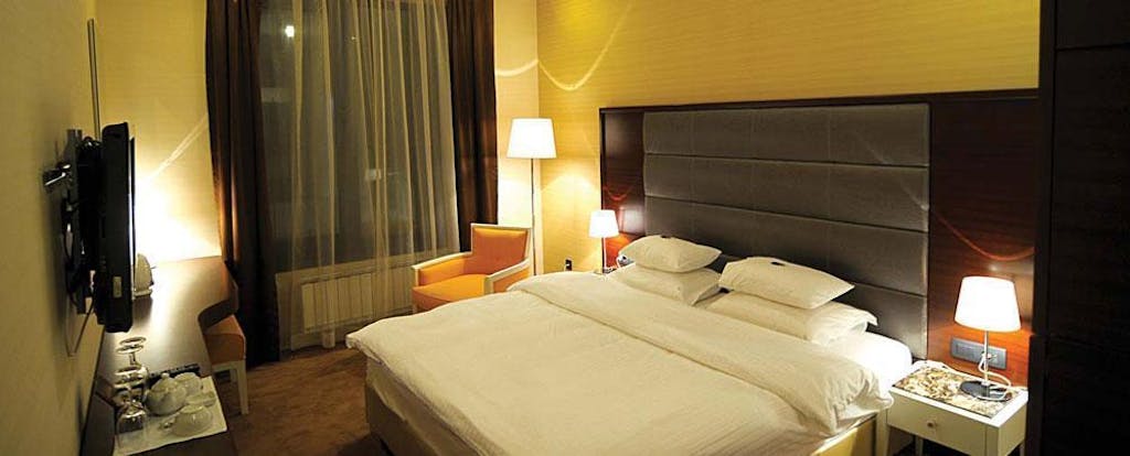 Savršen sklop sofisticiranih boja, ekstavagantnogenterijera, umirujućeg ambijentai komfornim velikim krevetom, oličenje su harmonije i modernog dizajna.Ovaj neobični apartmanupotpunjen je oazom relaksacije, prostrano kupatilo sa masažerom predstavlja pravi ugođaj nakon dugog, napornog dana.